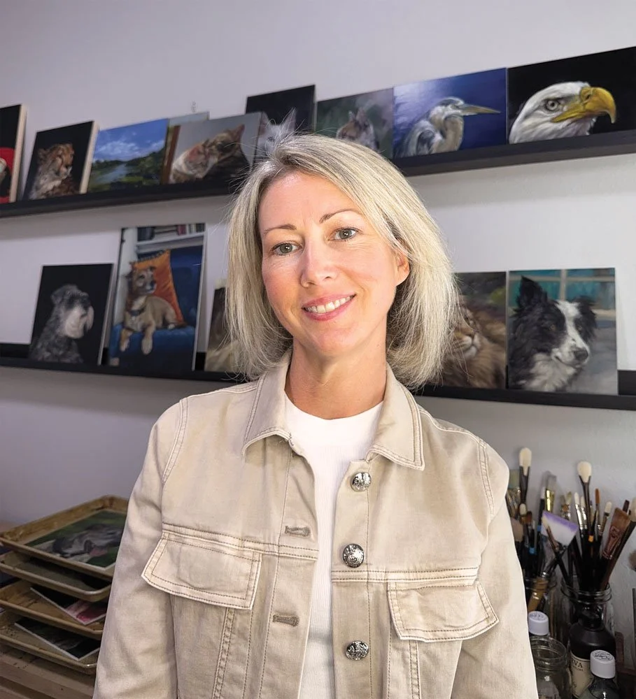 Korinne Burroughs, a Tampa-based oil painter with a Fine Arts degree, specializes in vibrant animal portraits. Blending impressionist flair with photo-realistic precision, she captures the essence of pets and wildlife through luminous layers and intricate details.